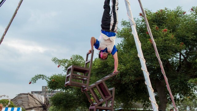 椅子倒立・ジャイアントバルーン・アクロバット・バルーンパフォーマンス・ダイススタッキング・ディアボロ・デビルスティック・ボールジャグリング・ファイヤーデビルスティック・火吹き・クラウニングです。ショーによって使わない演目もあります。