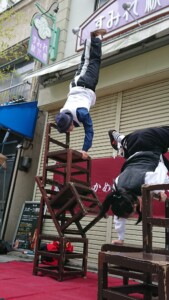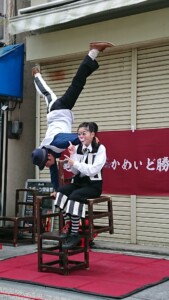 その亀戸香取神社のスポーツ灯籠ライトアップイベントに合わせて勝運商店街でかめいど勝運大道芸が行われました。